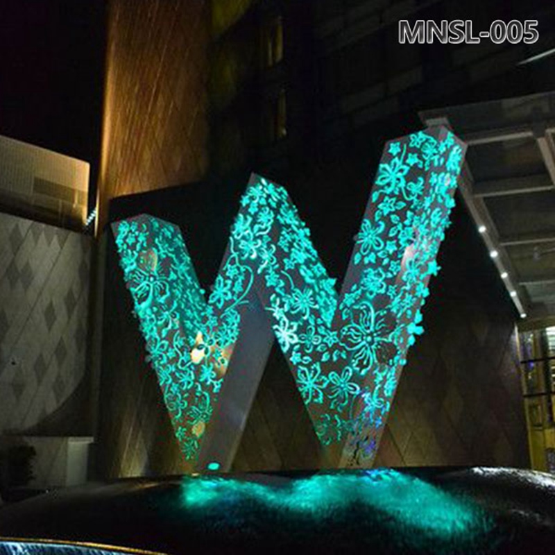 The surface of the letters is laser cut with an artistic pattern, creating a fascinating light and shadow effect that transforms any landscape into a visual feast. The stainless steel finish looks sleek and modern, and the internal lighting brings the sculpture to life, especially at night.