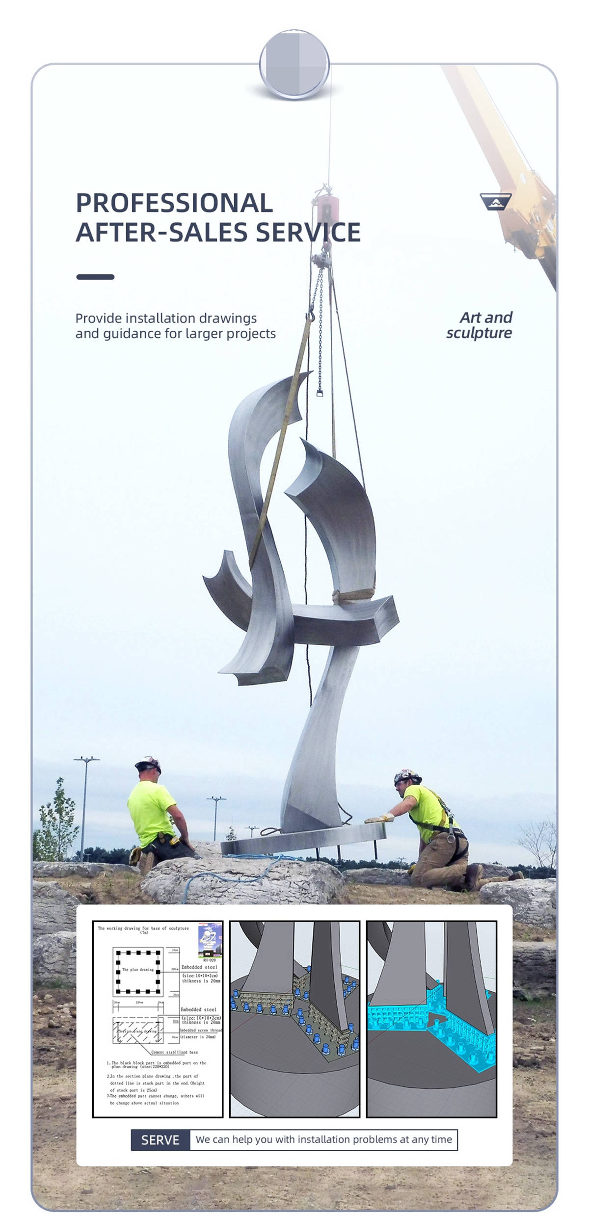 YouFine has extensive experience in the installation of large and medium-sized outdoor stainless steel sculptures and has the ability to guide installation. Detailed installation instructions and professional installation drawings will be provided to customers together with the metal wing sculpture. Professionals will help you solve all problems encountered during the installation process.