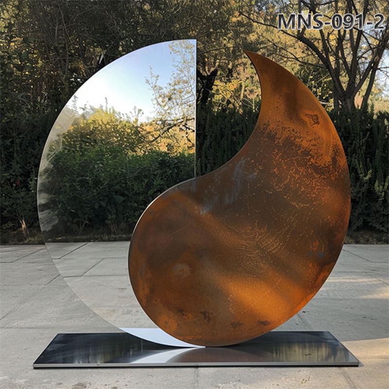 The outdoor metal art sculpture is crafted from a combination of stainless steel and corten steel. It boasts a striking mirror-polished finish on one side, while the other half features a rustic weathered steel patina. This stunning piece is ideal for enhancing garden landscapes, offering a captivating contrast of tones and a sense of dynamic asymmetrical balance.