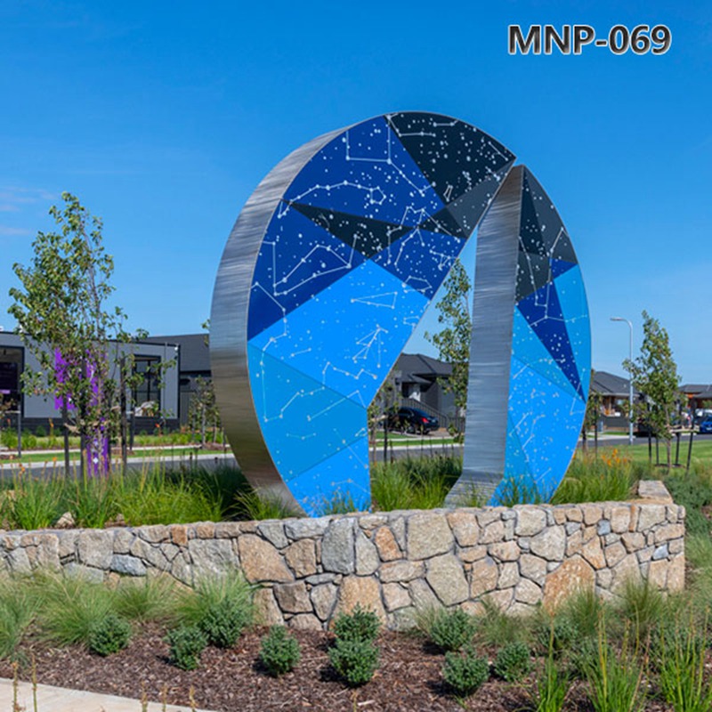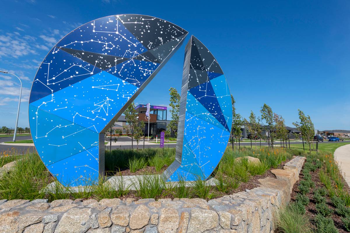 This is a fascinating metal landscape sculpture because its surface reveals the colors of the first stars at nightfall. The astrological focus displayed on the surface of the stainless steel sculpture is the slow changing moments of the Victorian night sky and constellations throughout the hours, days and seasons.