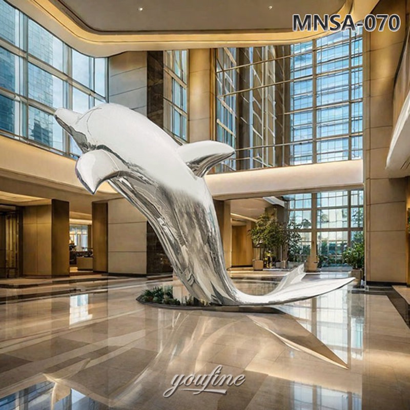 This large metal dolphin statue’s soaring appearance and dynamic stance bring an undeniable dynamism to modern decor. Perfect for high-end lobbies, grand atriums, luxury hotels and upscale residences, this dolphin sculpture transforms any environment into a sanctuary of beauty and inspiration. Natural light and the sculpture’s reflective surface combine to create an ever-changing visual experience, making it a focal point that continually engages and delights.