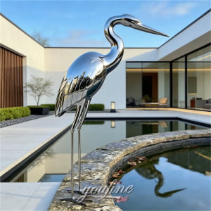 This is a highly polished, mirror-finish stainless steel sculpture of a grey heron, crafted with exquisite artistry to capture the…